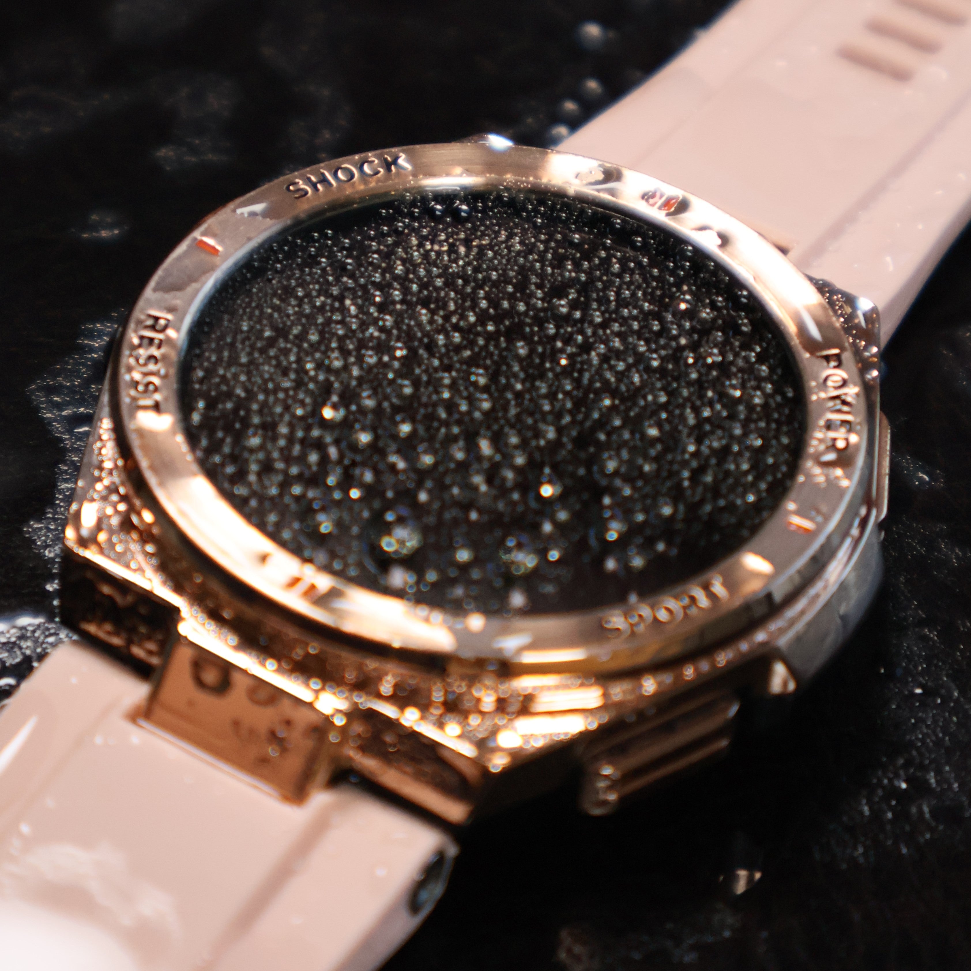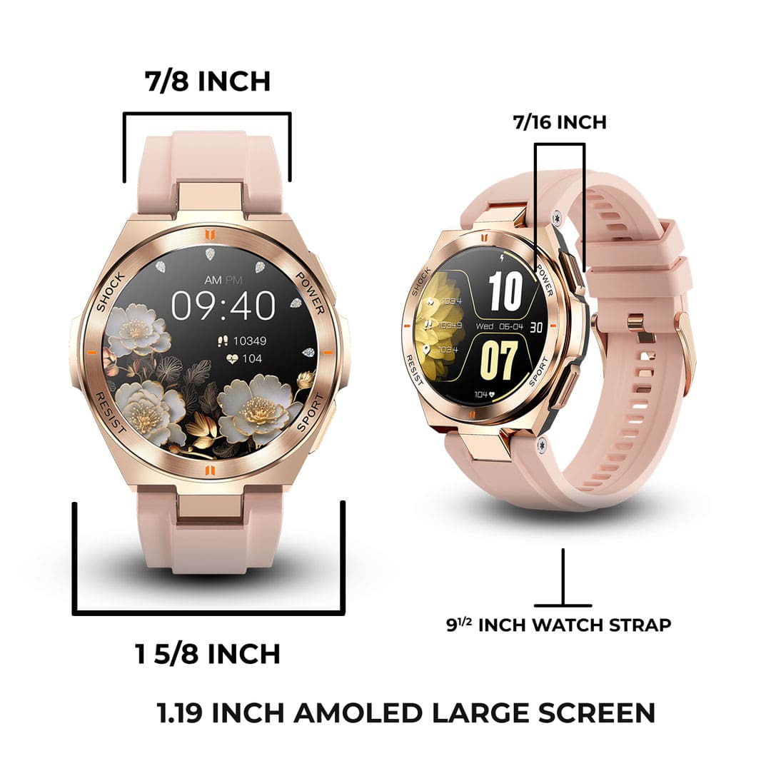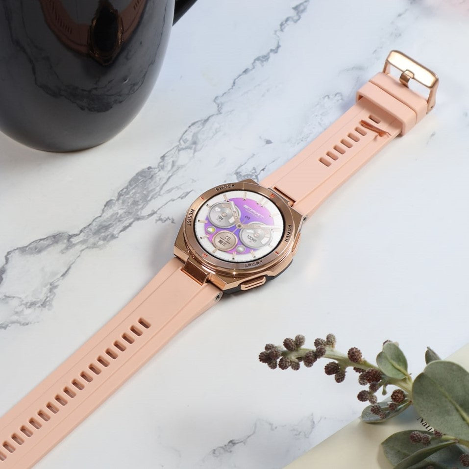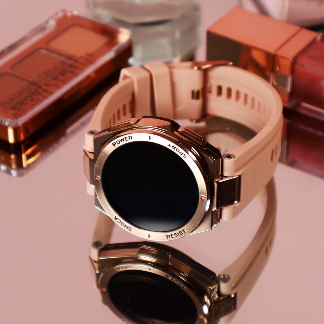 Zulu features a scratch-resistant Gorilla Glass screen and a rose gold frame, designed for elegance and durability. Includes two bands: black and rose, for versatile styling options.